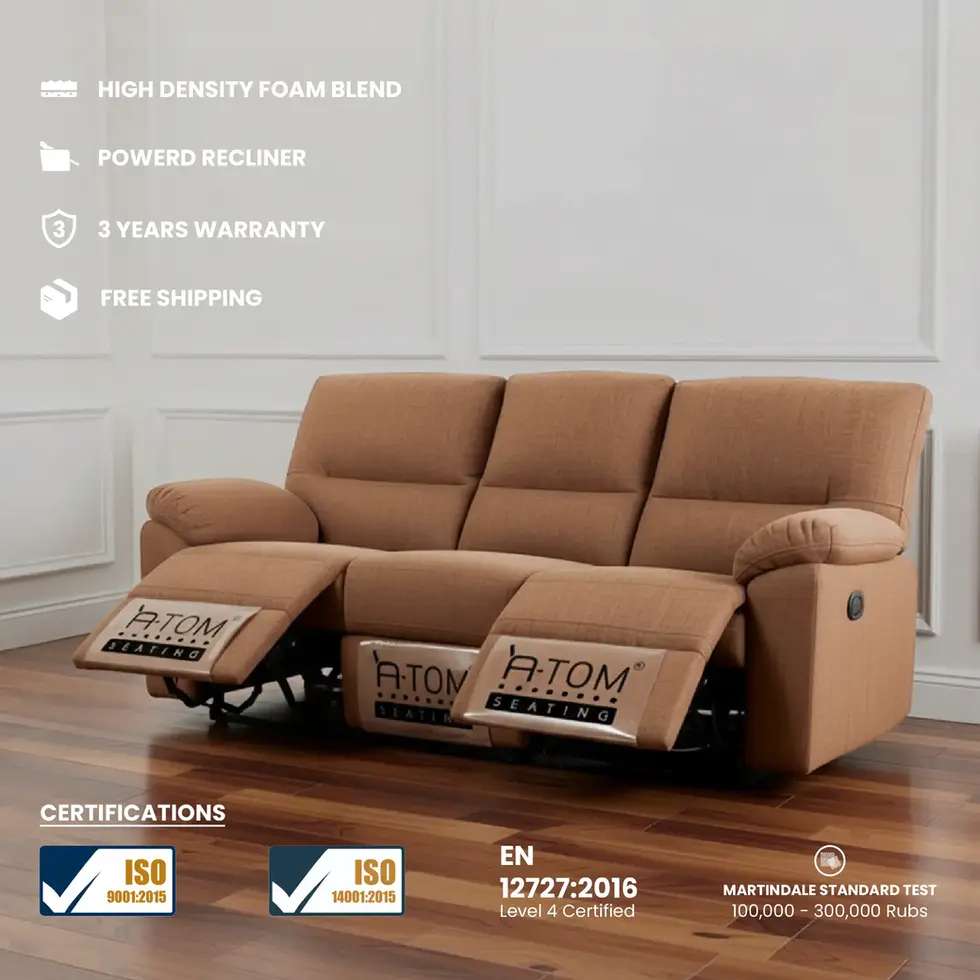 Atom Seating™ Home recliners and sofas are tested rigorously and certified for quality. The Barium model meets EN12727:2016 standards for durability and safety and passes the Martindale wear and abrasion test, ensuring exceptional fabric resistance and longevity. These certifications make it a standout option for buyers seeking a premium recliner sofa with certified durability.